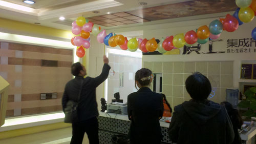 临近年末,顶上集成吊顶无锡专卖店率先装扮了起来,一只只彩色的气球挂在门口,还有憨态可掬的喜洋洋公仔立在门口代替我们欢迎消费者,令消费者一进来就能感受到一股欢乐的气氛。